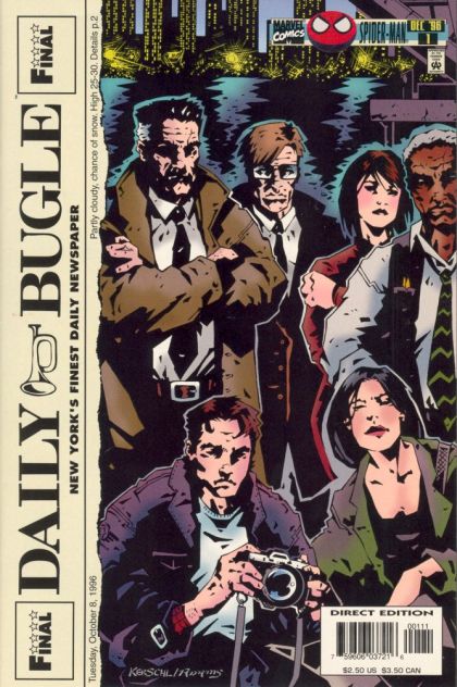 Cover pencils by Karl Kerschl, inks by Greg Adams. Front Page, script by Paul Grist, pencils by Karl Kerschl, inks by Greg Adams; Ben Urich discovers that Morgan Hall is trying to form a crime syndicate and flees after being discovered; Ben and Angela Yin are chased by thugs for their pictures of the events; They discover that they've photographed Congressman Henry Adams cavorting with Susie Dawn, and Hall wants the pictures so he can blackmail Adams; The Daily Bugle runs the story and Adams confesses. Peter Parker saves Betty from being shot and they witness the murder of Jimmy Fude. 36 pgs., full color. $2.50. Cover price $1.95.