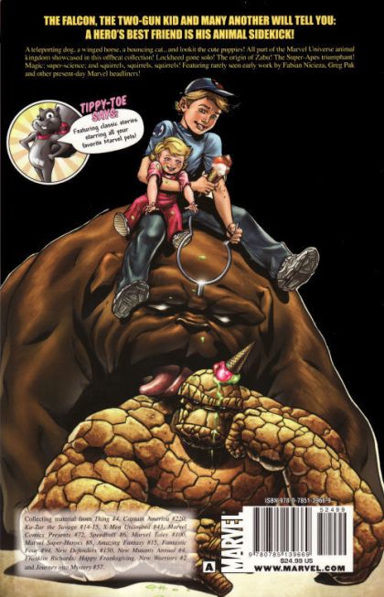 Written by STAN LEE, STEVE DITKO, MARY JO DUFFY, SCOTT EDELMAN, PETER GILLIS, STEVEN GRANT, BRUCE JONES, LARRY LEIBER, WILL MURRAY, FABIAN NICIEZA, GREG PAK, LOUISE SIMONSON, DAN SLOTT, MARC SUMERAK & ZEB WELLS Penciled by JACK KIRBY, STEVE DITKO, JUNE BRIGMAN, BOB BUDIANSKY, ANDREA DIVITO, CHRIS ELIOPOULOS, GIL KANE, VAL MAYERIK, TAKESHI MIYAZAWA, MICHAEL NETZER, DON PERLIN, JAVIER SALTARES, PAUL SMITH & SKOTTIE YOUNG Cover by KARL KERSCHL The Falcon, the Two-Gun Kid and many another will tell you: A hero's best friend is his animal sidekick! A teleporting dog, a winged horse, a bouncing cat...and lookit the cute puppies! All part of the Marvel Universe animal kingdom showcased in this offbeat collection! Lockheed gone solo! The origin of Zabu! The Super-Apes triumphant! Magic; super-science; and squirrels, squirrels, squirrels! Featuring rarely seen early work by Fabian Nicieza, Greg Pak and other present-day Marvel headliners! Collecting material from THING #4, CAPTAIN AMERICA #220, KA-ZAR THE SAVAGE #14-15, X-MEN UNLIMITED #43, MARVEL COMICS PRESENTS #72, SPEEDBALL #6, MARVEL TALES #100, MARVEL SUPER-HEROES #8, AMAZING FANTASY #15, FANTASTIC FOUR #94, NEW DEFENDERS #150, NEW MUTANTS ANNUAL #4, FRANKLIN RICHARDS: HAPPY FRANKSGIVING, NEW WARRIORS #2 and JOURNEY INTO MYSTERY #57. 208 PGS./ Rated A ?$24.99