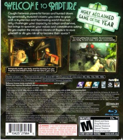 Considered to be one the finest games in the history of interactive entertainment, BioShock is a watershed entry into the world of video games. As one of the most lauded franchises in the past decade, BioShock introduces gamers into an exciting world filled with fascinating characters, intelligent enemies and complex moral choices that define the foundation of the game world. With its rich story, meticulous attention to visual detail, tense action and infinite replay value, BioShock delivers the perfect blend of storytelling and first person action.