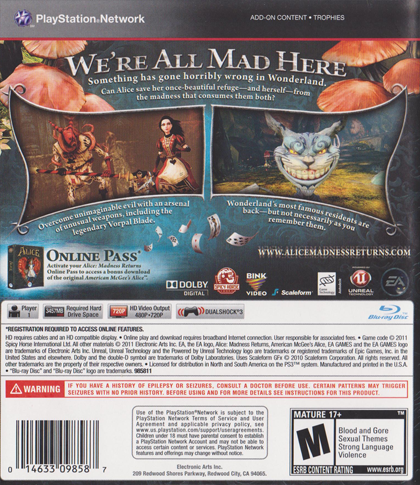 Alice: Madness Returns delves deep into the dark and violent side of the imagination, creating a nightmarish Wonderland where Alice must face the demons that haunt her visions. Visit the grim reality of Victorian London and then travel to the beautiful yet ghastly Wonderland to uncover the root of Alice's madness and discover the truth behind a deadly secret, kept hidden for years.