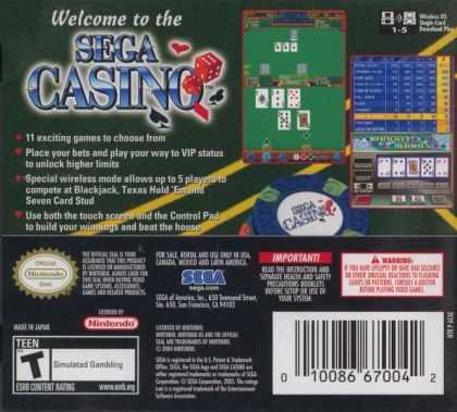 Players can place their bets on SEGA Casino's Roulette, Craps, Baccarat, and other unlockable games, including Chuck-a-Luck, Keno, and three Video Poker variants (Jacks or Better, Double Bonus, and Deuces Wild). They can improve their skills by taking on AI opponents solo, or they can play wirelessly with up to four friends by using a single cartridge and downloading SEGA Casino temporarily onto other players' DS units. Card game fans will be able to challenge friends in heated rounds of Black Jack, Texas Hold 'em, and the unlockable 7 Card Poker!