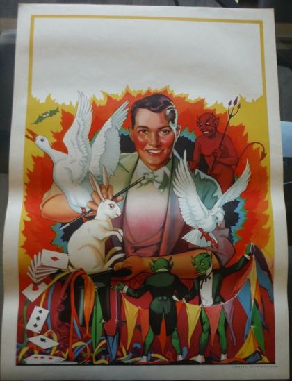 Step into the realm of enchantment with this authentic Vintage and Original Magic Poster from the 1940s. Featuring an enigmatic magician at the center, surrounded by his faithful doves, this piece captures the essence of a bygone era's magical charm. The intricate apparatus depicted adds to the allure, making it a captivating addition to any collector's assemblage or a mystical touch to your home decor. Expertly preserved, the poster reflects a period when magic was a captivating spectacle, inspiring wonder and admiration. It is a testament to the timeless allure of the genre, ideal for enthusiasts of magic history or those with an appreciation for vintage artistry. Add this unique piece to your collection and let its nostalgic aura elevate your space.This poster is in excellent condition, never folded. New old stock. Will ship rolled in tube. Erie litho, Approx size 28" x 20."