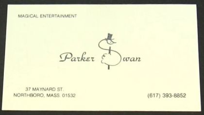 Legendary magician, PARKER SWAN...business card. Card is in great condition for its age. On the back are hand written notes made by David Goodsell, former S.A.M. President and decades long editor of the MUM magazine.