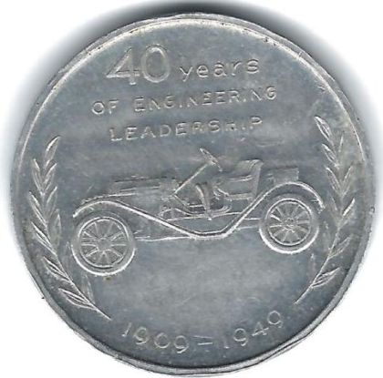 OBV: An Antique car, "40 Years / Of Engineering / Leadership / (wreaths) / 1909 - 1949"