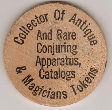 Interesting silhouette of magician on one side and Collector of Antique & Magicians Tokens and Rare Conjuring Apparatus, Catalogs on the reverse.