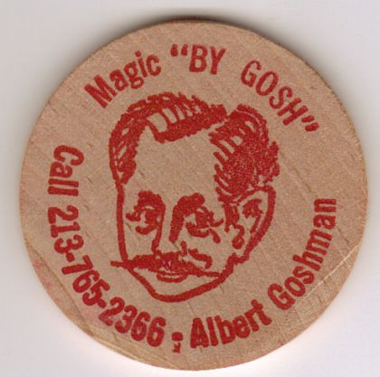 Promotional piece featuring Caricature of Albert Goshman and his phone number on one side and a profile Wooden Nickel with Indian on the reverse.FOUR copies. Red printing. Goshman 1920-1991