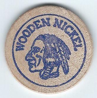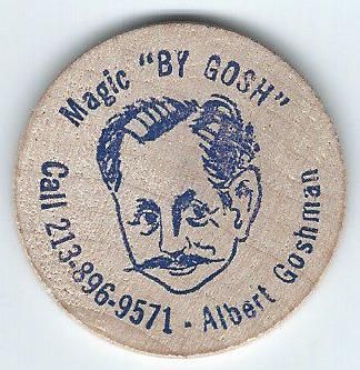 Promotional piece featuring Caricature of Albert Goshman and his phone number on one side and a profile Wooden Nickel with Indian on the reverse.FOUR copies. Red printing. Goshman 1920-1991