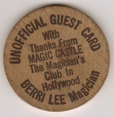 Wooden Nickel - Unofficial Guest Card Wth Thanks from Magic Castle The Magician's Club to Hollywood. Berri Lee Magician