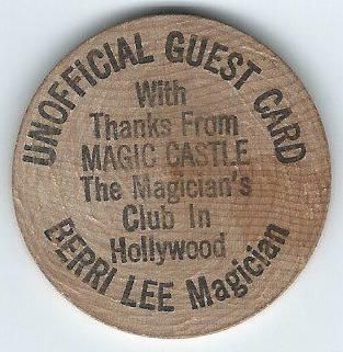 Wooden Nickel - Unofficial Guest Card Wth Thanks from Magic Castle The Magician's Club to Hollywood. Berri Lee Magician