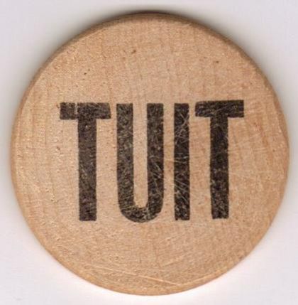A VERY UNUSUAL ADVERTISING ITEM USING A WOODEN NICKEL AND MADE BY TUIT.