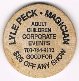 Vintage Wooden Nickel - Lyle Peck Magician - Adult Children Corporate Events - 703-764-9112 - Good for $25 Off Any Show.