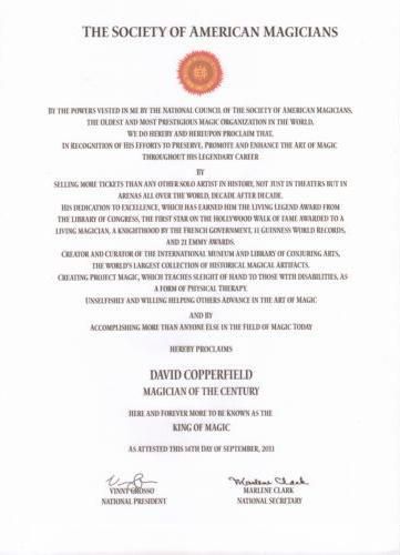 New York, NY - The Society of American Magicians (S.A.M.) will award illusionist David Copperfield their highest honor today, "Magician of the Century", and name him the ‘King of Magic,’ an award which has never before been given by the association. S.A.M., the oldest and most prestigious magic organization in the world founded in 1902 and led by past president Harry Houdini himself, is recognizing Copperfield for his efforts to preserve, promote and enhance the art of magic throughout his legendary career. Its esteemed national president, Vinny Grosso, says that Copperfield has, "accomplished more than anyone else in the field of magic today." Copperfield was named Magician of the Century for the last century, and Magician of the Millennium from other organizations.