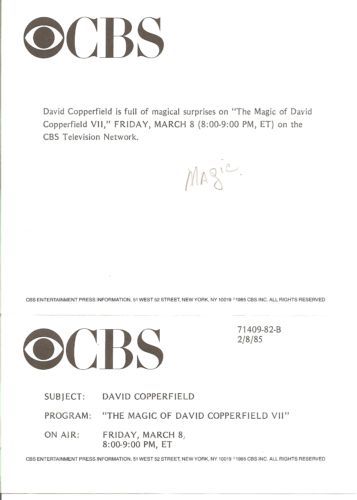 The Magic of David Copperfield VII Original CBS TV Network Photo.