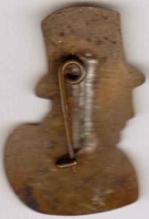 Brass pin in the shape of a man wearing a top hat. 1-1/8" tall, about 3/4" wide. Printed in red, black, and white. The front reads "MANDRAKE MAGICIANS CLUB Taystee BREAD" and incised below that is "COPR 1934 KING FEATURES." Metal spring pin and loop closure on reverse. The paint is worn