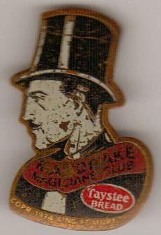 Brass pin in the shape of a man wearing a top hat. 1-1/8" tall, about 3/4" wide. Printed in red, black, and white. The front reads "MANDRAKE MAGICIANS CLUB Taystee BREAD" and incised below that is "COPR 1934 KING FEATURES." Metal spring pin and loop closure on reverse. The paint is worn