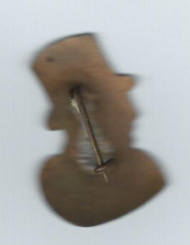 Brass pin in the shape of a man wearing a top hat. 1-1/8" tall, about 3/4" wide. Printed in red, black, and white. The front reads "MANDRAKE MAGICIANS CLUB Taystee BREAD" and incised below that is "COPR 1934 KING FEATURES." Metal spring pin and loop closure on reverse. The paint is worn
