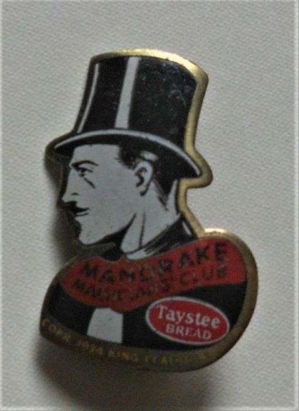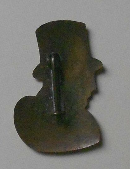 Brass pin in the shape of a man wearing a top hat. 1-1/8" tall, about 3/4" wide. Printed in red, black, and white. The front reads "MANDRAKE MAGICIANS CLUB Taystee BREAD" and incised below that is "COPR 1934 KING FEATURES." Metal spring pin and loop closure on reverse. The paint is worn