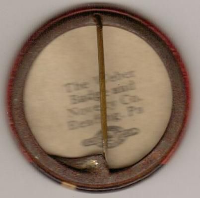 Celluloid with whispering demons is in nice glossy clean condition with some wear and slight bumpiness. The reverse has complete Weber Badge and Novelty Co., Reading, Pa. with union logo or bug backpaper.