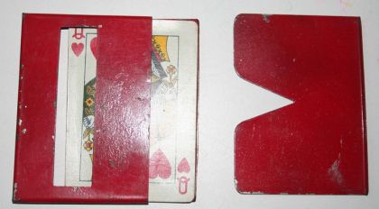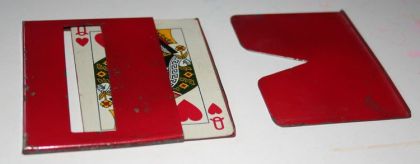 This clever piece of apparatus was marketed by Joe Berg many years ago. It has been made for bothe Poker cards and Jumbo. There are also descriptions and routines in "Greater Magic" and the "Tarbell Course".