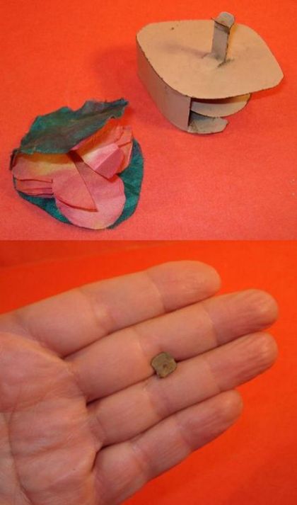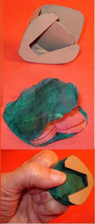 Spring Loaded Metal Gimmick used to produce single spring flowers from your hand. Holder has spring loaded panel inside the metal holder. You fill this with paper and cloth spring flowers, not attached to each other, and no strings. One side of holder has a finger clip so the holder can be held between to fingers, with holder hidden on back of hand. Bend your fingers in so thumb can slide out a single spring flower. This may be awkward, depending on the size of your hand. Another way to use it would be to hold it inside your hand as seen in the second set of images. Hand will appear flat. When you want a spring flower, slide your thumb over the opening in the gimmick and a single flower will slide out, opening at your fingertips. The internal spring inside the gimmick keeps pushing the remaining flowers to the front so you can slide them with your thumb. There was one older flower in the gimmick. You will have to supply the rest.
