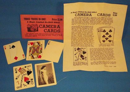 This is the Camera Cards, put out by Lloyd Jones, in 1943. You show five cards, and then take two an pretend they are a camera. The Two of Spades is slid between them, and you can see the Two of Spades. Pretend to take a picture and the Two of Spades is now a blank card. "Let me try that again". You put another card, the 10 of Spades between the two camera cards, and you can see the Ten of Spades. "Think of a card, and I'll try to take a picture of your mind". The Ten of Spades is taken out and now is a mixed up card, with multiple corner pips, numbers, a kings head. "Let me try it again" The last card is slid between the two camera card, and you can see it is the Five of Spades. "Think of anything you want!"? When you take out the center card that was the Five of Spades, you now find a photo of a beautiful nude woman. Comes with all cards, original instructions, in original envelope, as issued by Lloyd Jones in 1943.