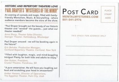 Jump up ^ "Cortland Repertory Theatre Downtown Presents Magic and Mystery with Paul Draper Mysteries of the Mind". BroadwayWorld.com. Retrieved 2017-02-18.