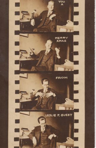ITEM: One unused Christmas postcard belonging to LESLIE GUEST. Photo has cinematic reel with Guest's photo in different poses.