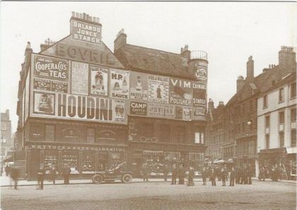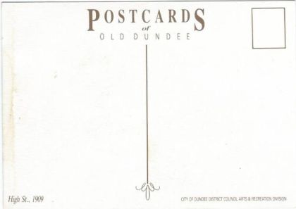 HOUDINI POSTCARD IN SEPIA, WITH HOUDINI BROADSIDE BANNER ON BUILDING FRONT, REAR HAS POSTCARDS OF OLD DUNDEE, HIGH ST. 1909 CITY OF DUNDEE DISTRICT COUNCIL ARTS & RECREATION DIVISION.