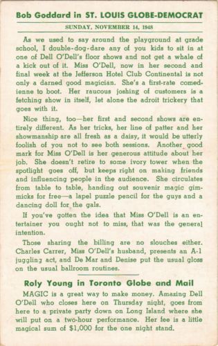 Dell O'Dell was the stage name of Nell Newton (20 Oct 1902 - 5 Feb 1962) an American magician regarded in her profession as a pioneer who provided a role model for modern female performers and noted for being one of the first magicians to appear on television. At the height of her career she was billed as "The World's Leading Lady Magician" and "The Queen of Magic."[1]