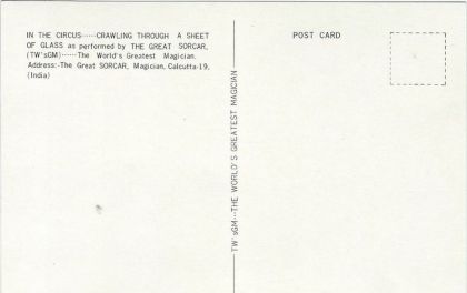 This is a lot of 4 vintage (new, NOS, New Old Stock) post cards featuring The GREAT Socar magician from Calcutta, India. 2 of them are identical. GREAT condition...These have been stored in a picture album for many many years! These thing were sent to Jerry in an envelope of promotional things from Socar back in the 60's.