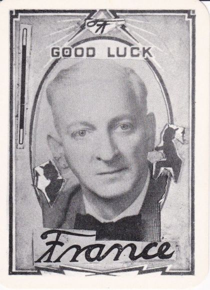 (1906-1992) American magician from the Baltimore area who billed himself as the "Del-Mar-Va Magician" and "France the Magician". He performed some spectacular stunts such as driving a car blindfolded. Also ran a mailorder magic shop, specializing in inexpensive tricks, jokes and novelties. An energetic and enthusiastic self-promoter, France took one of Howard Thurston's scaling cards, pasted his own photo over the face of Thurston, and reprinted the cards with his own name on them.