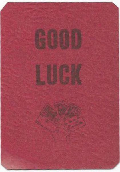 FRONT: "GOOD LUCK" printed above an image of a hand holding a fan of five cards.