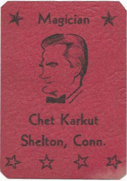 BACK: Caricature of him in center with text above, "Magician". Text below, " Chet Karkut / Shelton, Conn."