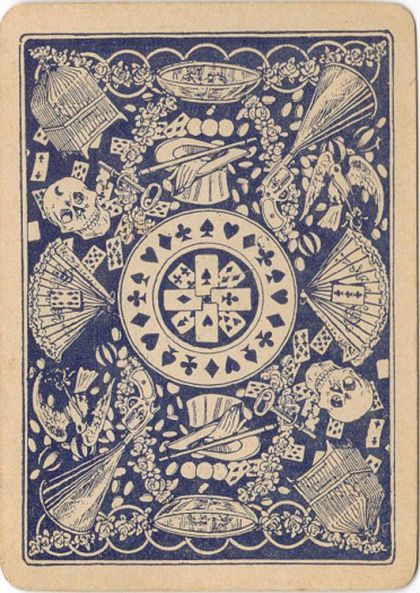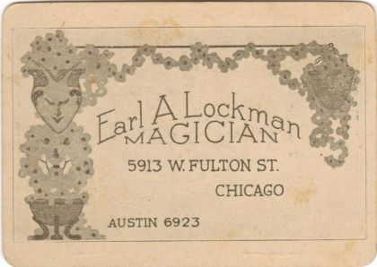 Vintage 1920's card, for a Magician in Chicago---Earl A. Lockman. Back of card has magic tricks, card tricks and sculls in its intricate design.