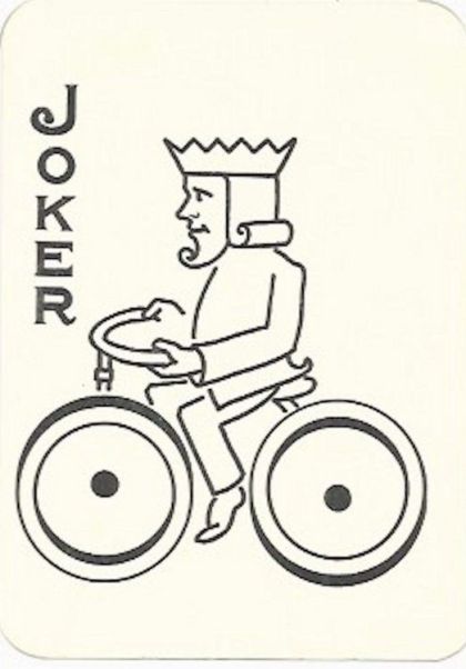 BACK IMAGE: Drawing of a playing card king riding a bicycle. JOKER printed down left edge.