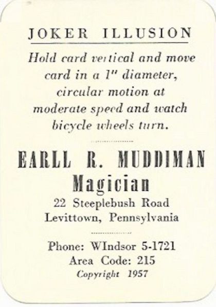 FRONT IMAGE: All text with explanation of the Joker Illusion on the back. This is followed by his name, address, phone, and Copyright 1957.
