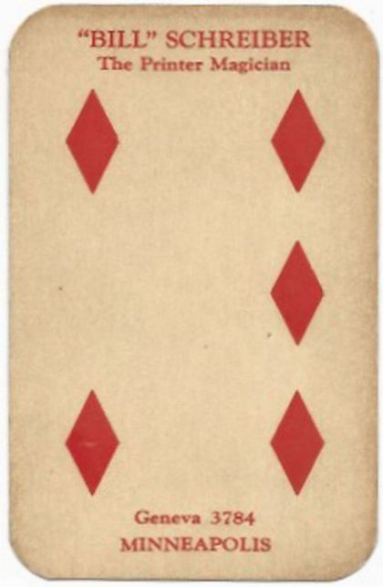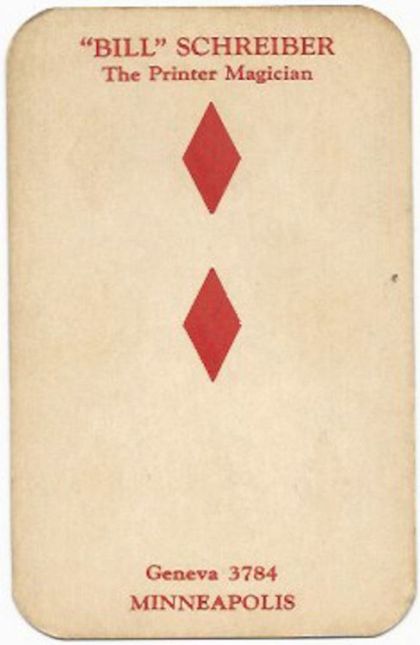 FRONT: Text for "Bill" Schreiber-The Printer Magician, Gemeva 3784 MINNEAPOLIS, with 2 diamond pips, to show as an ace of a three of diamonds.