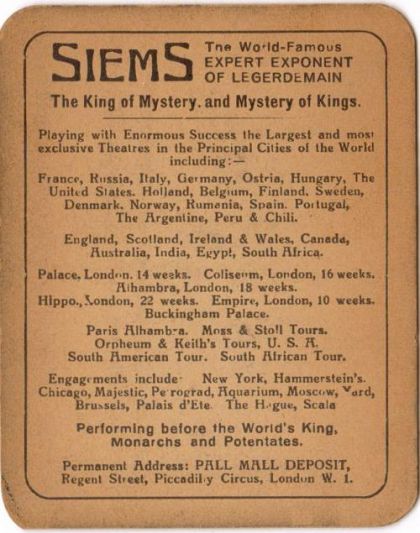 Siems reported to Abracadabra magazine that he appeared as the first magician to play at Rose Bowl, Pasadena, July 7, 1963. He also claimed to be the sole magical appearance at Soldiers' Field in Chicago where he produced a fir-tree from a paper cone.