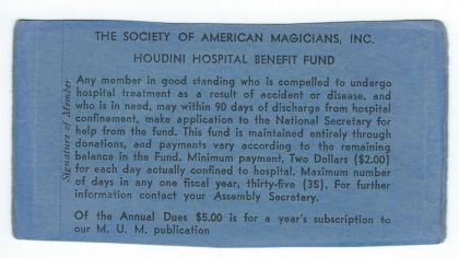 On April 26, 1902, thirteen men assembled, with W. Golden Mortimer as the chairman. "The time had come, they agreed, for a real organization of wizards. Committees were appointed to study possible by-laws and other details. Enthusiasm burned bright. Saturday, May 3rd, the group had grown to 23 men, and a week later, May 10th, The Society of American Magicians met for the first time as a permanent organization."[1] Dr. Saram Ellison, one of the co-founders, became member No. 1.