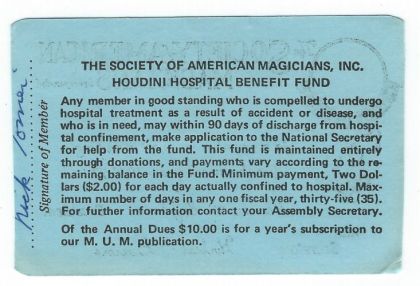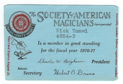 On April 26, 1902, thirteen men assembled, with W. Golden Mortimer as the chairman. "The time had come, they agreed, for a real organization of wizards. Committees were appointed to study possible by-laws and other details. Enthusiasm burned bright. Saturday, May 3rd, the group had grown to 23 men, and a week later, May 10th, The Society of American Magicians met for the first time as a permanent organization."[1] Dr. Saram Ellison, one of the co-founders, became member No. 1.