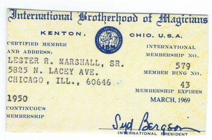 International Brotherhood Of Magicians Membership Card for Lester R. Marshall, Sr.