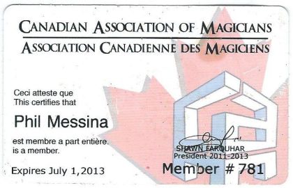 Canadian Association Of Magicians Membership Card for Phil Messina