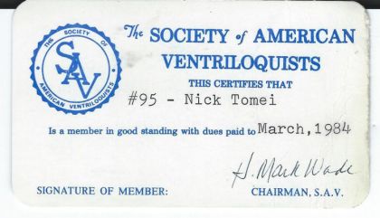 The Society Of American Ventriloquists Membership Card for Nick Tomei