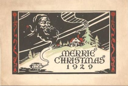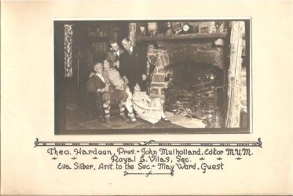 This is a Christmas card was purchased from Carl Lohrey. The front of the card shows Santa coming out of a Genie lamp with the initials S. A. M. on it, and reads, MERRIE CHRISTMAS 1929 (shown in the first photo). The inside cover reads, "Evning and the Fireplace at Royal Lodge, Headquarters of the Secretary Society of American Magicians National Council, Easton, Bridgeport, Conn". The second photo is of Theo. Hardeen (younger brother of Houdini, who passed away in 1945), Pres. John Mulholland, passed in 1970 (editor of the Sphinx for 20 years, had an extensive magic collection that now belongs to David Copperfield). Royal L. Vilas, Sec., Eva Silber, Asst. to the Sec., May Ward, guest. The card is made of heavy stock. It does show some soil on the front, but not bad after all these years. The photo is in the Sepia tones of the day.