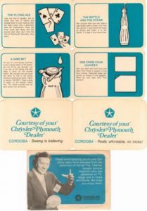 Promotion Give Away, Series of 12 Magic Cards From the 1960's or early 1970's For The New Release of the Chrysler Cordoba. Tricks were picked by Magician Karrell Fox.