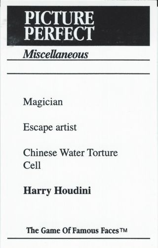 This game card was issued in the 1990s in the USA and carries a sketch drawn picture of the famous Magician : Harry Houdini. The reverse side of the card carries three clues as to his identity. This card measures approximately 4.0 inches by 2.5 inches.