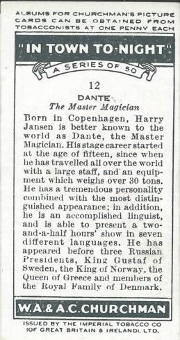This cigarette / tobacco card was issued by W A + A C Churchman in the UK in 1938 and comes from a set entitled 'In Town Tonight'. The front of this card carries a picture of Harry Jansen - better known of as Dante the Master Magician. The reverse side of the card carries an interesting description. This card measures approximately 2.7 inches by 1.4 inches. This is an original card issued in the year stated.