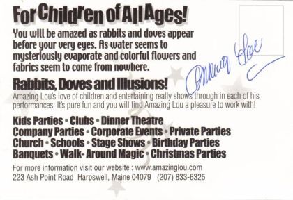 Lewis Ward a.k.a. Amazing Lou started into magic after inheriting his father's magic props and supplies. Lou grew up with his grandfather in Harpswell, Maine and learned his grandfathers trade as a Lobsterman. Lou's Father, Virgil Ward, was a furniture maker by trade and a professional magician.