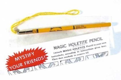 this pencil is a classic Blackstone promotional giveaway –consists of yellow pencils (7.5" x ¼") with looped yellow braided cords attached to silver metal caps at eraser end. The magician threads the loop through the "victim's" buttonhole, and they cannot remove it without knowing the secret. The yellow pencil is imprinted, "Blackstone Magic Show - 1982-1983 Tour." Comes in a glassine envelope with instructions on the envelope (8" x 4"). Good condition – new