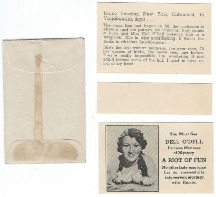 Dell O'Dell was the stage name of Nell Newton (20 Oct 1902 - 5 Feb 1962) an American magician regarded in her profession as a pioneer who provided a role model for modern female performers and noted for being one of the first magicians to appear on television. At the height of her career she was billed as "The World's Leading Lady Magician" and "The Queen of Magic."[1]